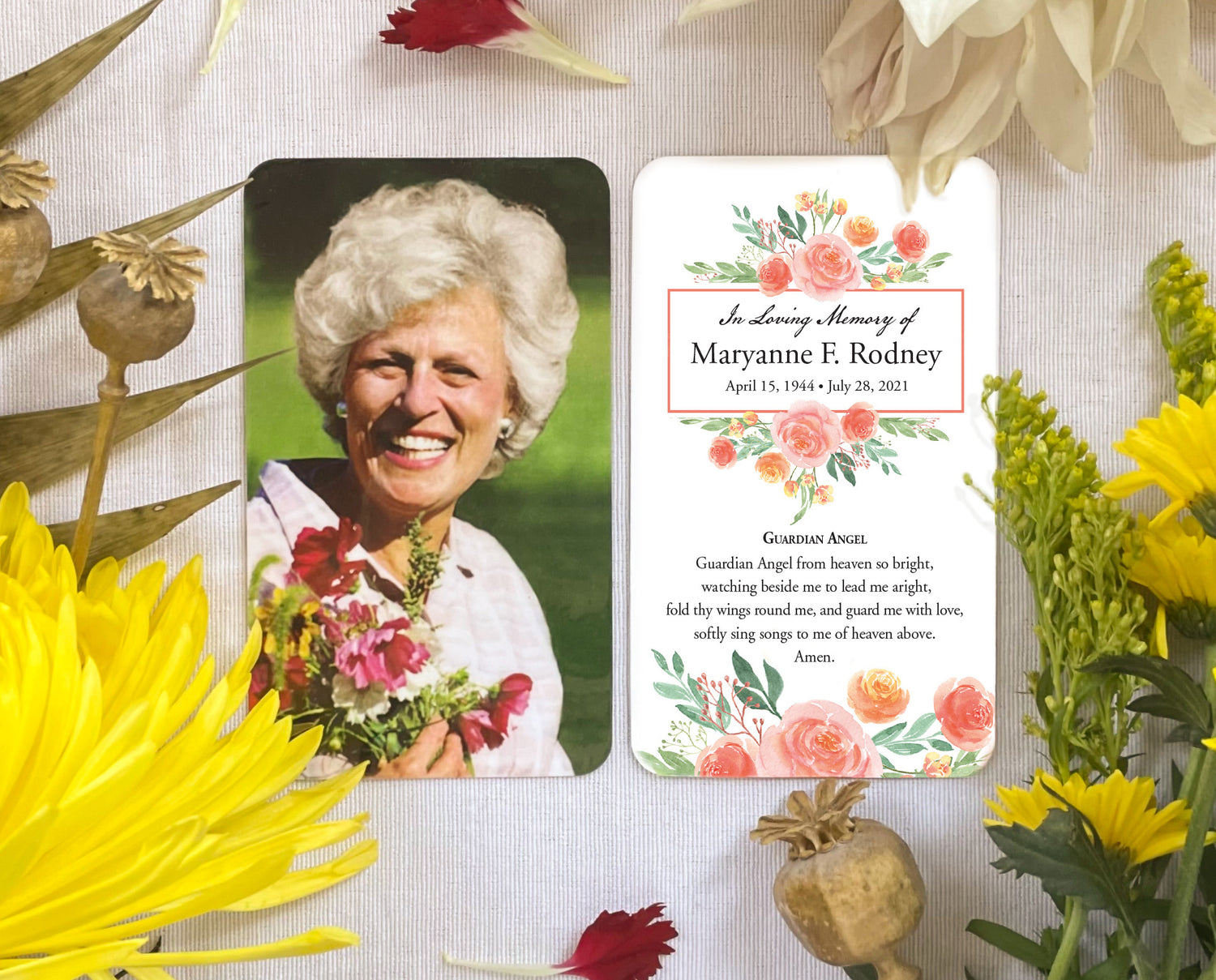 Coping with the loss of a loved one is a painful and difficult experience for anyone to endure. By sending your family and friends a personalized custom printed and laminated Memorial Prayer Card you pay a lasting tribute to your loved one.