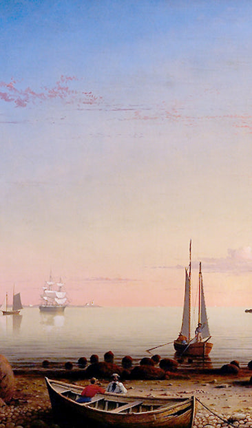Laminated card with rounded corners. Size: 2.25” x 4.5” a painting of a sail boat on a beach.
